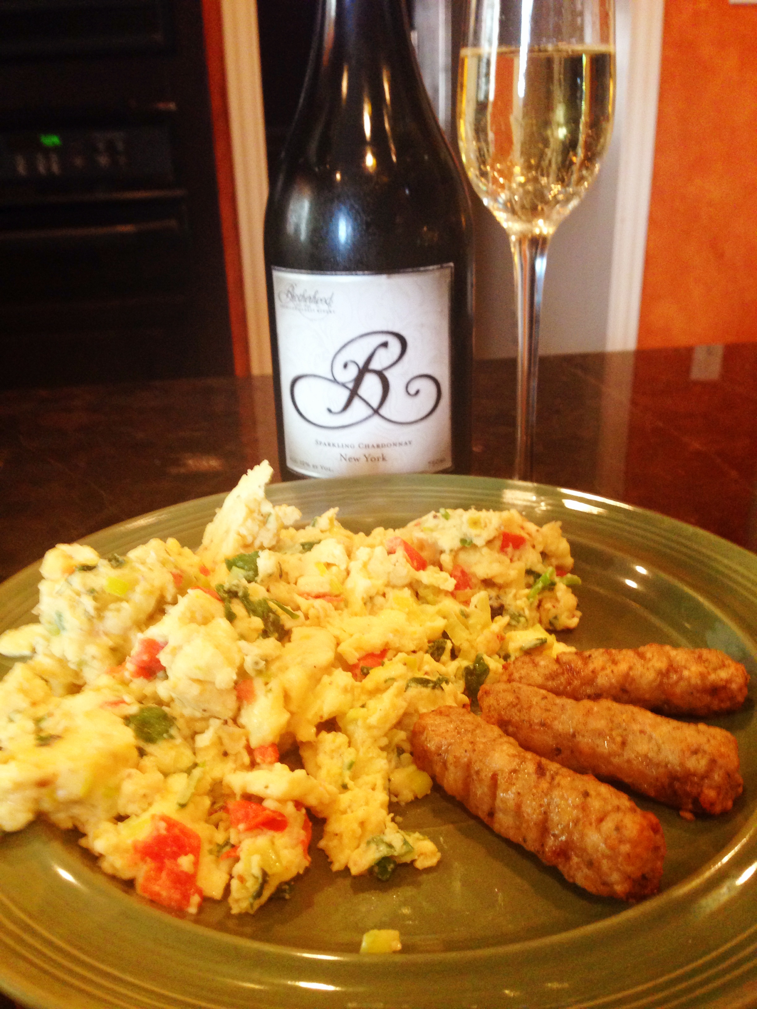 Brotherhood NV “B” Sparkling Chardonnay: These lovely bubbles glistened gold in the glass and met the nose with green apples, citrus, brioche and a faint hint of oak that was actually autolysis or “dead yeast.” On the palate this effervescent wine danced with flavors of green apple, lemon curd with a hint of lime, pears and a touch of crushed stone and yeast. It was refreshingly dry with a slight touch of sweetness and a soft creamy texture on the back of the palate. It offered medium body with a medium finish and was quite refreshing on a hot summer night. I paired the lovely sparkler with scrambled eggs filled with roasted tomatoes, garlic, leeks and arugula topped with melted cheddar and served with chicken maple sausage.