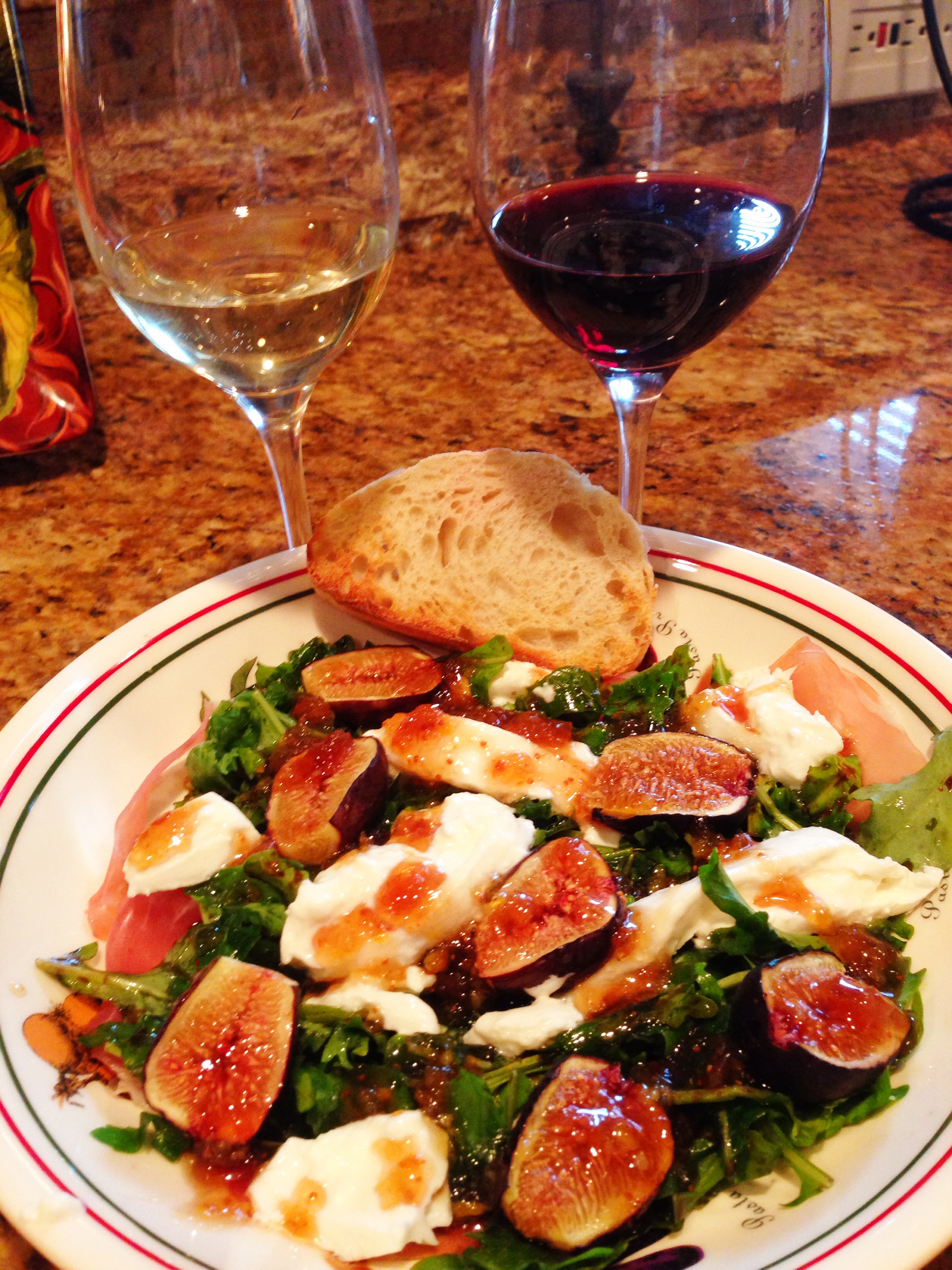 As I said both these wines were food friendly. I began by pairing each with an assortment of cheeses: Iberico, Drunken Goat and Manchego; as well as Marcona almonds, carmelized walnuts and dried apricots. Both wines paired well with those appetizers. For the entre I took my inspiration from a recent article I read by the Armchair Sommelier where she wrote of a salad she recently made from a recipe she found on Pinterest. Click here to read the Armchair Sommelier’s article and click here for the original recipe from Just a Taste. The salad was made of prosciutto, burratta, arugula, figs (I used roasted black mission figs), olive oil, balsamic vinegar and fig compote (I used fig preserves). She chose to pair the salad with champagne and asked her readers what they would pair with the salad. I thought the salad would pair great with the H Stagnari Cabernet Sauvignon from Uruguay I recently wrote about because when I think figs and balsamic vinegar I think red. I felt like this #WineStudio with both a red and a white from Millbrook would be the perfect time to test out this salad. BOTH wines paired excellently with the salad. My personal preference was the red because it’s my style; however, it was a win-win!