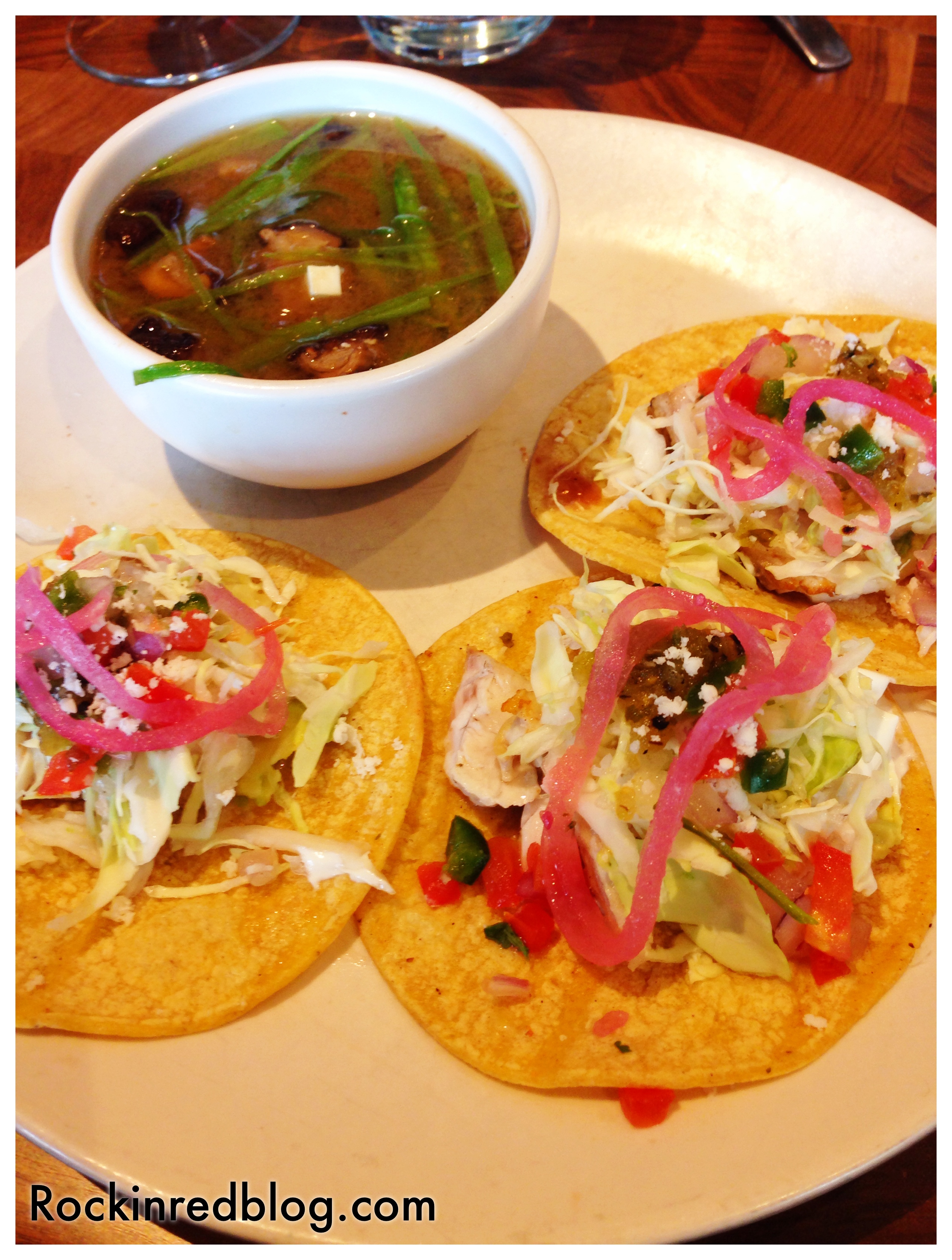 I began my lunch with Edamame Dumplings that were outstanding. I shared them with one of my friends but could have eaten probably 2 full dishes myself. The thin wonton dumplings were filled with creamy edamame and topped with Daikon Radish and White Truffle Oil in soy sauce. The wine offered a beautiful balance between the saltiness and creaminess of the dish. For my main course I enjoyed True Food Kitchen’s Street Tacos: three small corn tortillas topped with Texas Red Fish, avocado, Cotija cheese, tomatillo salsa, and sour cream. I chose to switch the side of Ansazi beans with a cup of miso soup (an odd combination with tacos but a nice segway from the dumplings). The wine was a light and smooth pairing with the truly delicious tacos and balanced beautifully with the mushrooms in the soup. Overall, it was at outstanding meal and I look forward to dining at True Food Kitchen again!