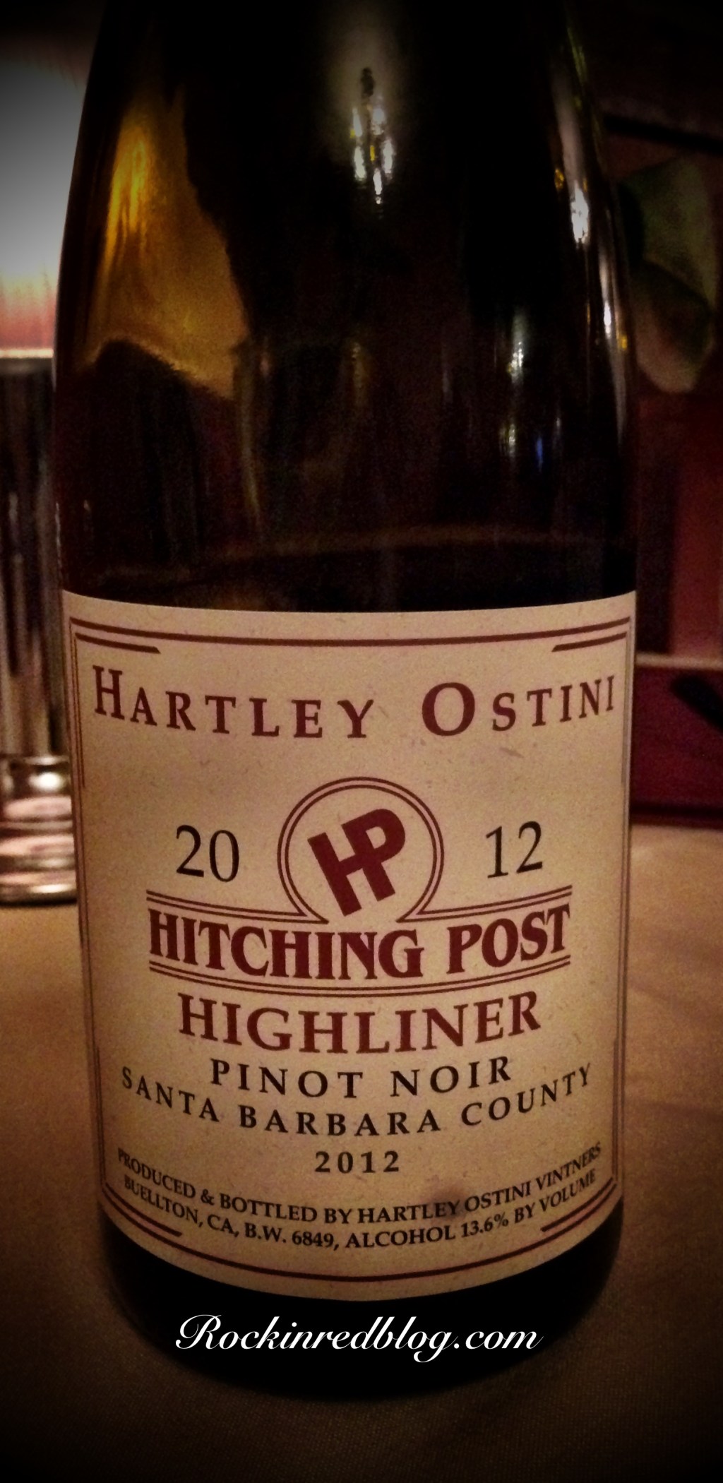 HPII Highliner2Hartley Ostini Hitching Post 2012 Highliner Santa Barbara County Pinot Noir: We began our evening by ordering this lovely wine. It poured a medium ruby into the glass and opened with inviting aromas of black and red berries and spice. On the palate this elegantly restrained Pinot Noir delivered flavors of black raspberries, blackberries, red raspberries and cherries along with anise, spice box and a lingering touch of toasted cedar and a hint of minerality giving it a satisfying grit. This wine was light in weight yet full in flavor with well-structured acidity and restrained tannins that offered a clean finish. The Highliner is the top vintage from Hitching Post wines; therefore, the best barrels from the best vineyard to craft this Pinot Noir. SRP $48 at restaurant/ $42 from web site. Click here to purchase this lovely Pinot Noir with a Hollywood background direct from Hartley Ostini Hitching Post Wines web site. Please note HP has a full selection of wines so I recommend you visit the web site to view their entire portfolio.