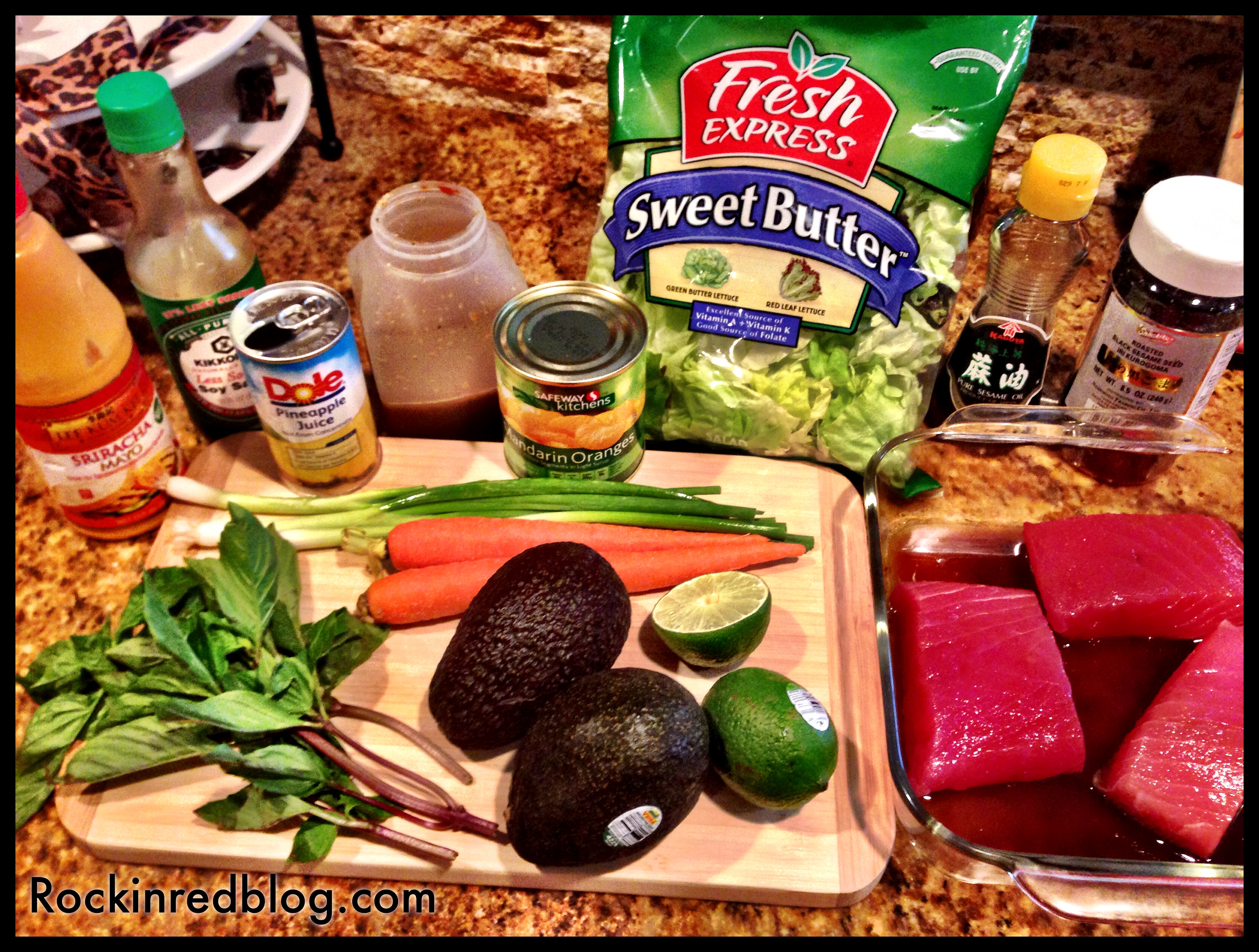 I wanted to make a fresh spring salad to pair with this wine so I crafted a seared Ahi Tuna salad with a citrus Asian vinaigrette. I made the salad using Butter lettuce, Thai basil, shredded carrots, diced green onions, avocado, mandarin orange slices and topped with Ahi tuna steaks I marinated in soy sauce and pineapple juice, coated in black sesame seeds and pan seared for 3 minutes then sliced and added with a drizzle of Sriracha sauce. I topped the salad with a delicious Asian Citrus Vinaigrette; you can find that recipe here. The salad was fresh, crisp, light and refreshing; furthermore, it paired beautifully with the acidity and flavors of the rosé; Another awesome dinner and wine pairing!