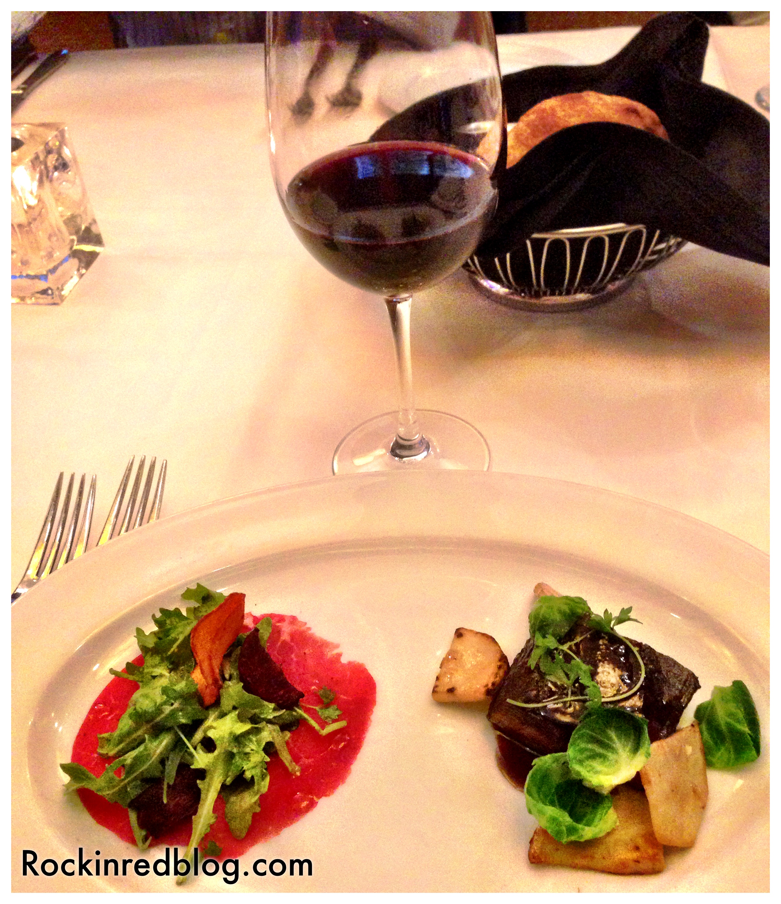 These two wines were paired with Beef Carpaccio: beet chips, baby arugula, roated Cipollini Vinaigrette and 20-Hour Short Ribs: Malbec Juis Lie, Brussels Sprout leaves, roasted celeriac