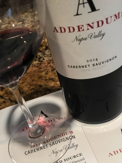 2014 Addendum Cabernet Sauvignon Napa Valley USA ($90): 100% Cabernet Sauvignon sourced from 33% Stagecoach Vineyard and 67% other Napa Valley vineyards; deep ruby; medium+ aromas plums, currants, cherries, black berries, sweet baking spice, dusty roses, fresh tobacco leaves, dried savory herbs, milk chocolate, vanilla; ripe and round, fruit forward on palate with nice dusty earth on finish, elegant, balanced medium+ acidity and youthful tannins, full body, long finish, fantastic aging potential; 276 cases