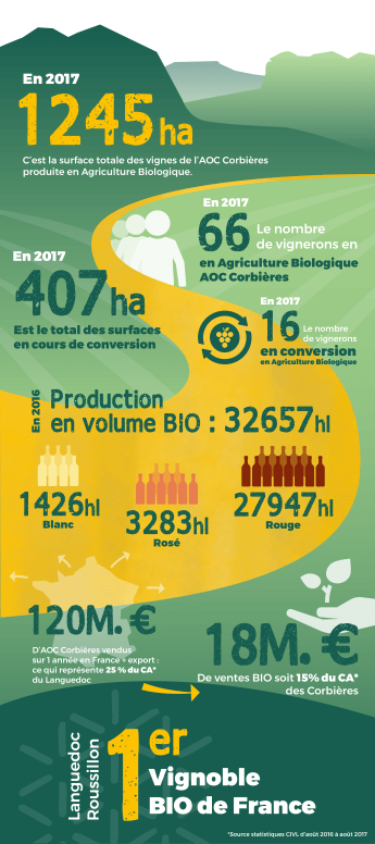 Permitted grapes in Corbières include Carignan, Syrah, Cinsault, Grenache Noir, Lladoner pelut, Mourvèdre, Picquepoul noir, Terret noir, Bourboulenc, known as Malvoisie in Corbières, Grenache Blanc, Maccabeu, Clairette, Muscat (10% maximum), Piquepoul, Terret blanc, Marsanne, Roussanne and Rolle, aka Vermentino. This translates in production to 88% red wine, 9% rose, and 3% white. It is also a region that embraces organic and biodynamic winemaking practices as a norm.