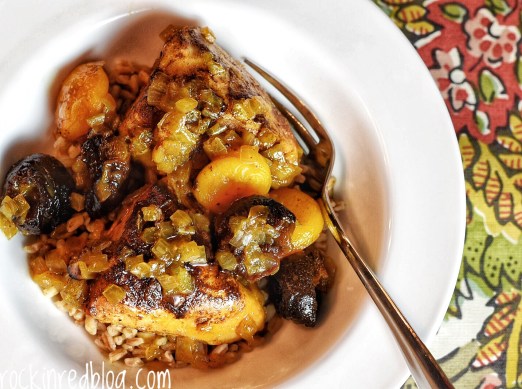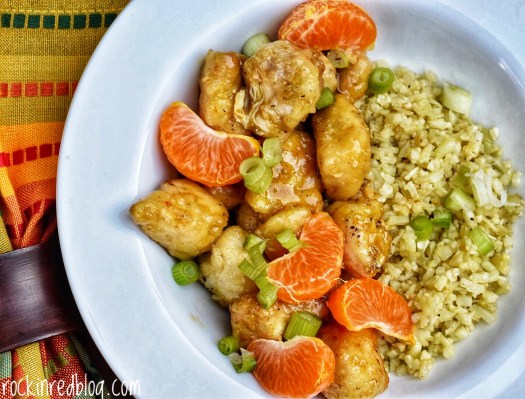 My Choice: I wanted to keep with the chicken and prune theme but wanted a different recipe. I was making this dish on a cold, rainy night while we were watching March Madness. Spring was 3 days away but it felt more like late fall or winter outside. Furthermore, I look for any excuse to use my Tagine. Therefore, I chose to make Chicken Tagine with Apricots and Prunes. But that’s not all. I also made a new favorite: Whole 30 Orange Chicken with Cauliflower Rice. And I had to make my favorite wine cocktail; the Friends. 75