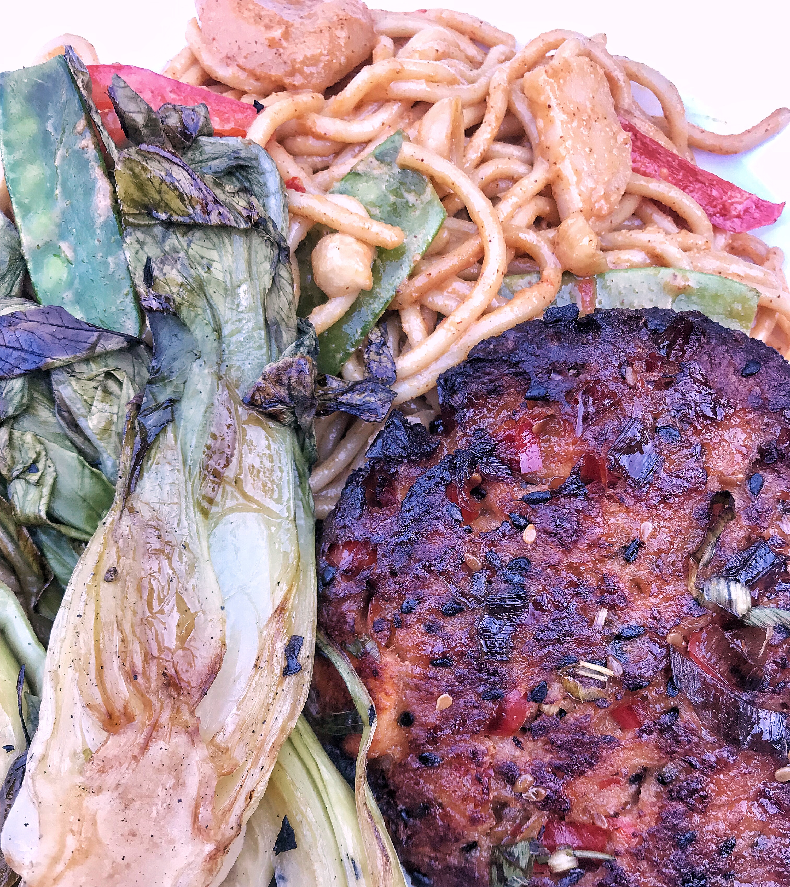 Rias Baixas Albarino WinePW salmon burger grilled leeks peanut noodle dinner