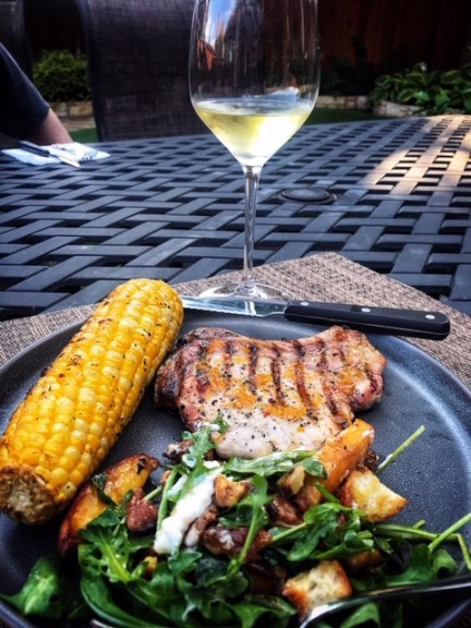 I paired the Chenin Blanc with Juicy Grilled Pork Chops with a Spicy Peach Glaze, grilled corn-on-the-cob, and a Peach Panzanella Salad with Burrata and Bacon. It was a perfect al fresco meal—light, crisp, a touch of sweetness from the peaches—and a great way to welcome June!